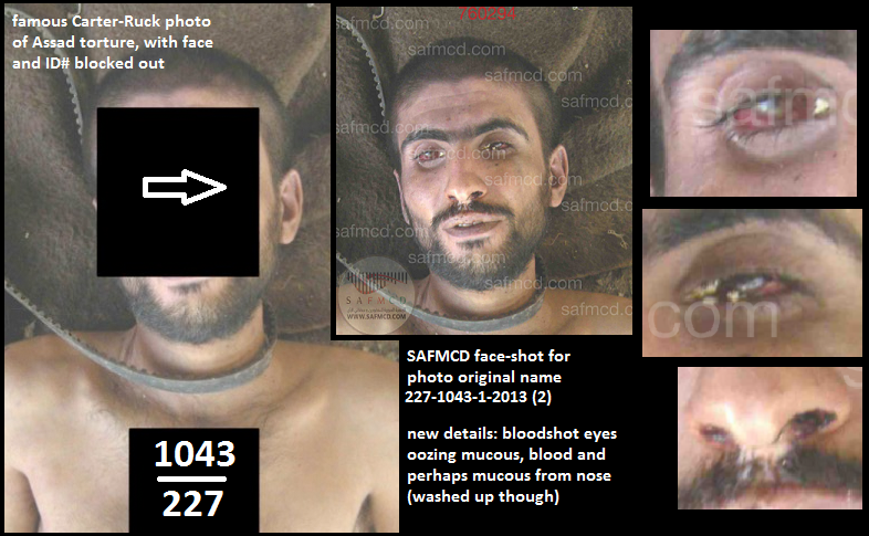 "Caesar" is widely advertised as totally winning, a hero for truth and justice, risking his life. But his life might be a work of fiction. No one can really know yet who the victims are and who killed them. But over the last ten months, I and teammates at A Closer Look On Syria have compiled some good analysis and questions on the page Torture Photos from "Caesar" and its talk page. This research is the starting basis for the material in the posts linked above. From the main page there,