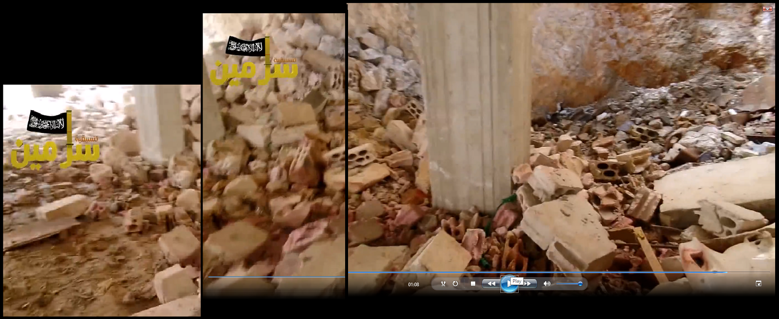 That's all satellite views suggest, but 7 months passed between the latest image and the events in question. Video suggests there might be a new addition as of March 2015. The 9:00 civil defense night video, at 4:58, passes over something that seems vertical, some slab, with a gap at the base that seems like a cut in the concrete - with some kind of canister on the right, a little past the second pillar line in. This is the big mystery of the scene so far, marked ??? in the middle of the second image at top. Apparent location marked C? (was too far in) This would run quite near the north wall, but seems a bit too close to be that. As it turns out, this is also about where the vent or hole should be, and also pretty close to slot A. No hole and no slot is visible - unless that cut is the slot, here plugged with a vertical slab ... otherwise, what the bomb fell through is on the other side of that vertical mystery thing.