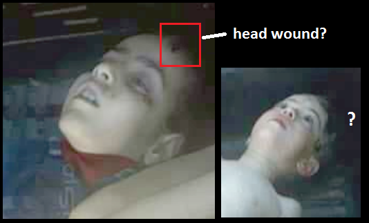 I was slow to notice there are at least two stills of this scene, where almost every kid has moved or been moved (see ACLOS posting: higher resolution view is current, earlier view still visible below). So, I suppose they're alive and wiggling, not dead at all. The head wound is quite possibly a wet hair illusion. The higher resolution view clarifies that's the case with the kid marked "?", so maybe with the other. (His head is off-frame in the better view).