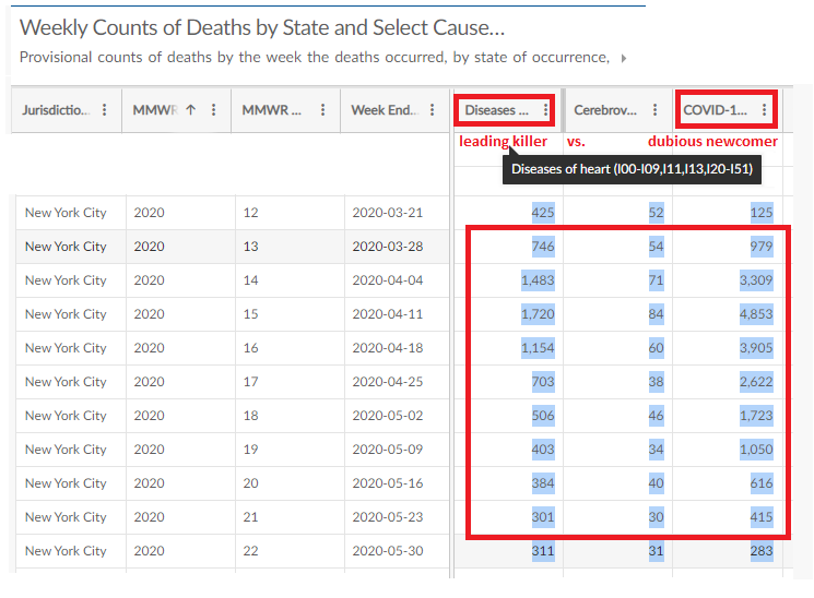 In parts of Italy, weekly deaths from COVID-19 were far more than heart disease and all other causes combined. I recall hearing Bergamo (IIRC) suffered up to 800% the normal mortality before the virus was reigned in. If so, that suggests the virus (and/or lockdown, etc. - something new) briefly killed 7x as many as all other causes combined. Don't quote me on that part, but it definitely can kill more than heart disease if allowed. (and some bonus questions: do we see NYC's share of missing heart deaths here? How many more were there supposed to be in those weeks, and why?)